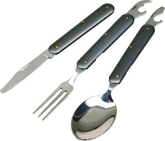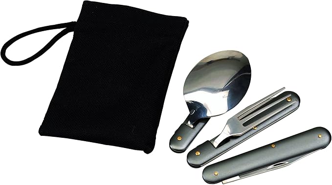 Posate da campeggio pieghevoli in acciaio inossidabile, con sacchetto, forchetta, cucchiaio, coltello, apribottiglie e apriscatole.